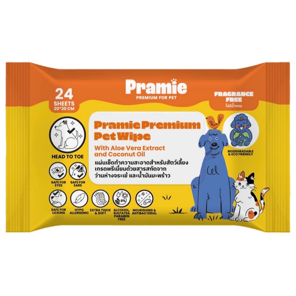 [12แถม1] Pramie แผ่นเช็ดทำความสะอาดสำหรับสัตว์เลี้ยง สูตรไม่มีน้ำหอม แพ็คเล็ก 24 แผ่น 20x20 ซม.