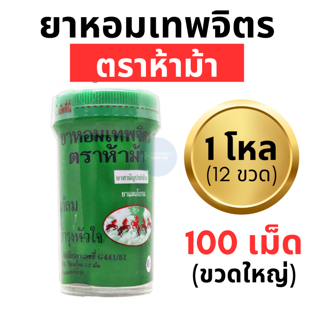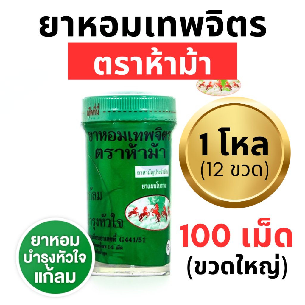 ยาหอมเทพจิตร ตราห้าม้า 1 โหล (12 ขวดใหญ่) ชนิดเม็ด เม็ดอม (100 เม็ด)