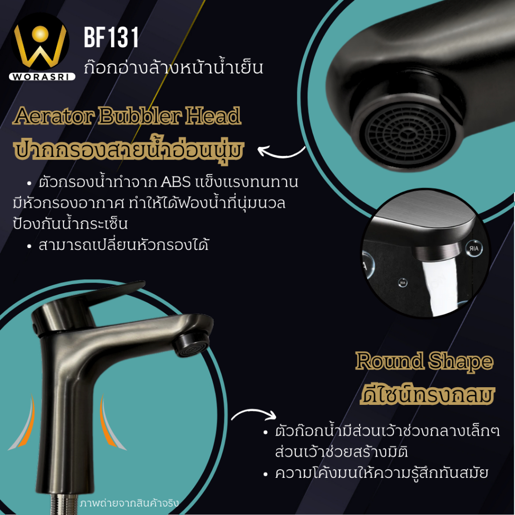 WoraSri BF131 ก๊อกน้ำเย็นอ่างล้างหน้าก้านปัดโยกสวยหรู+สายน้ำดี สแตนเลส 304 สีเทาดำ ก 14 สูง 14.5 ซม.