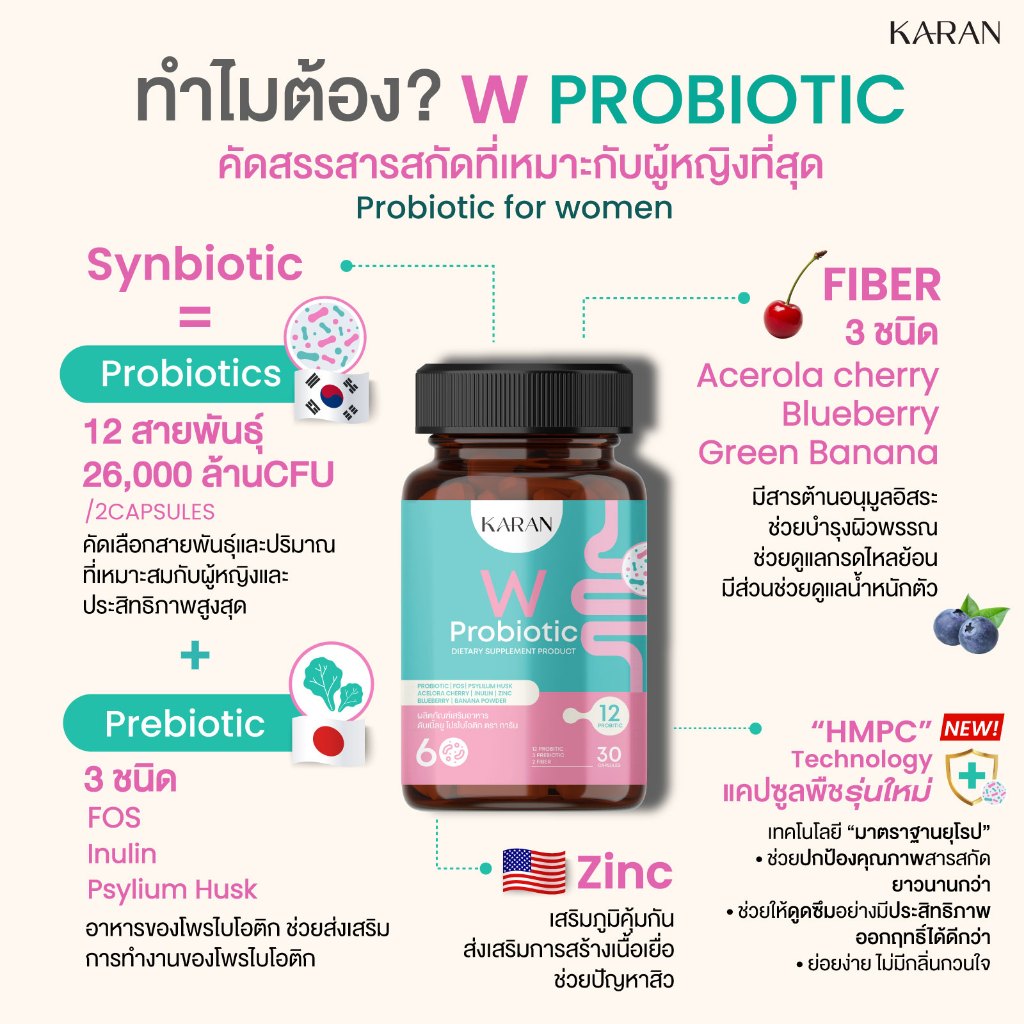 KARAN WProbioticเพื่อผู้หญิง โพรไบโอติก12สายพันธุ์+พรีไบโอติก3+Fiber3 จุดซ่อนเร้น ขับถ่าย ผิวพรรณ