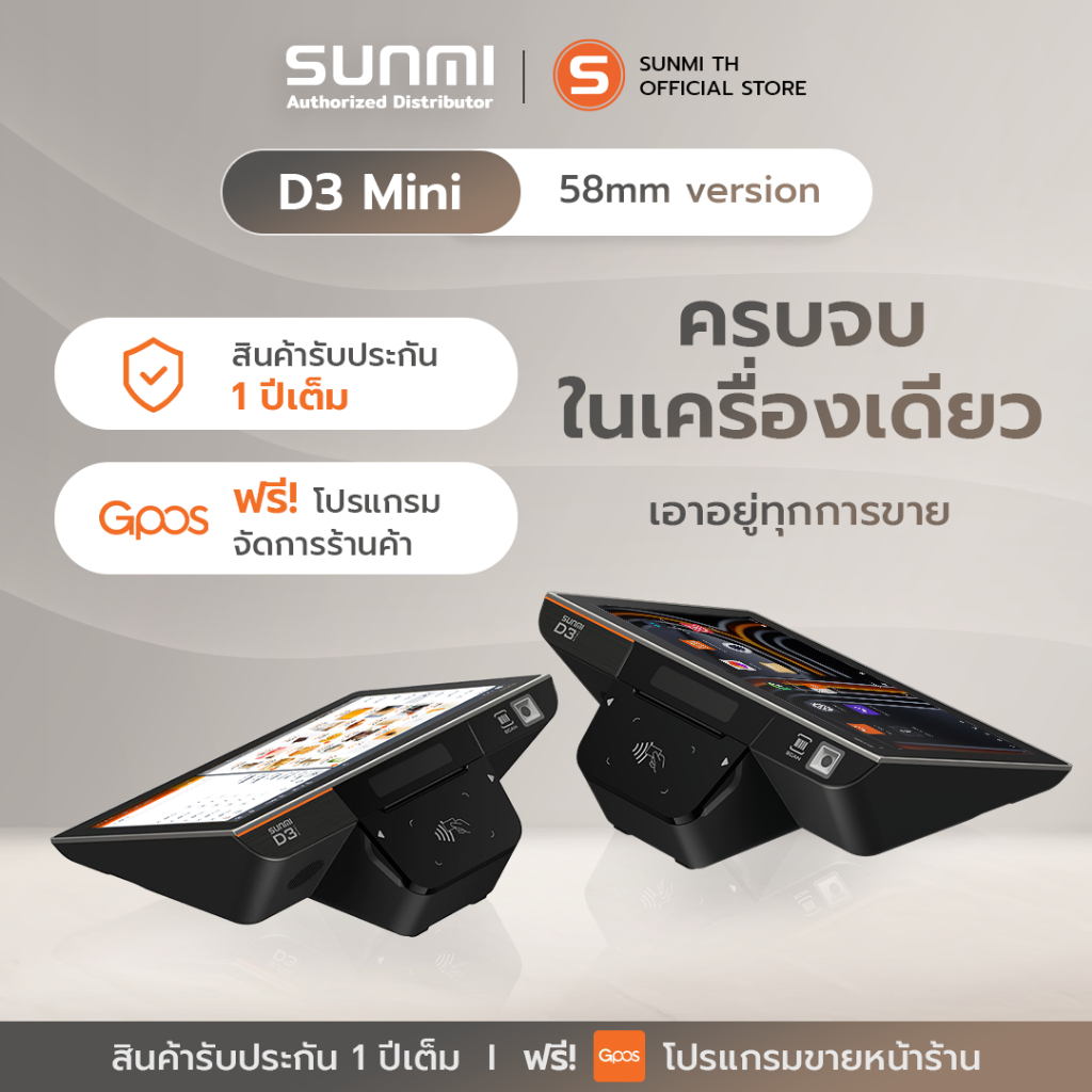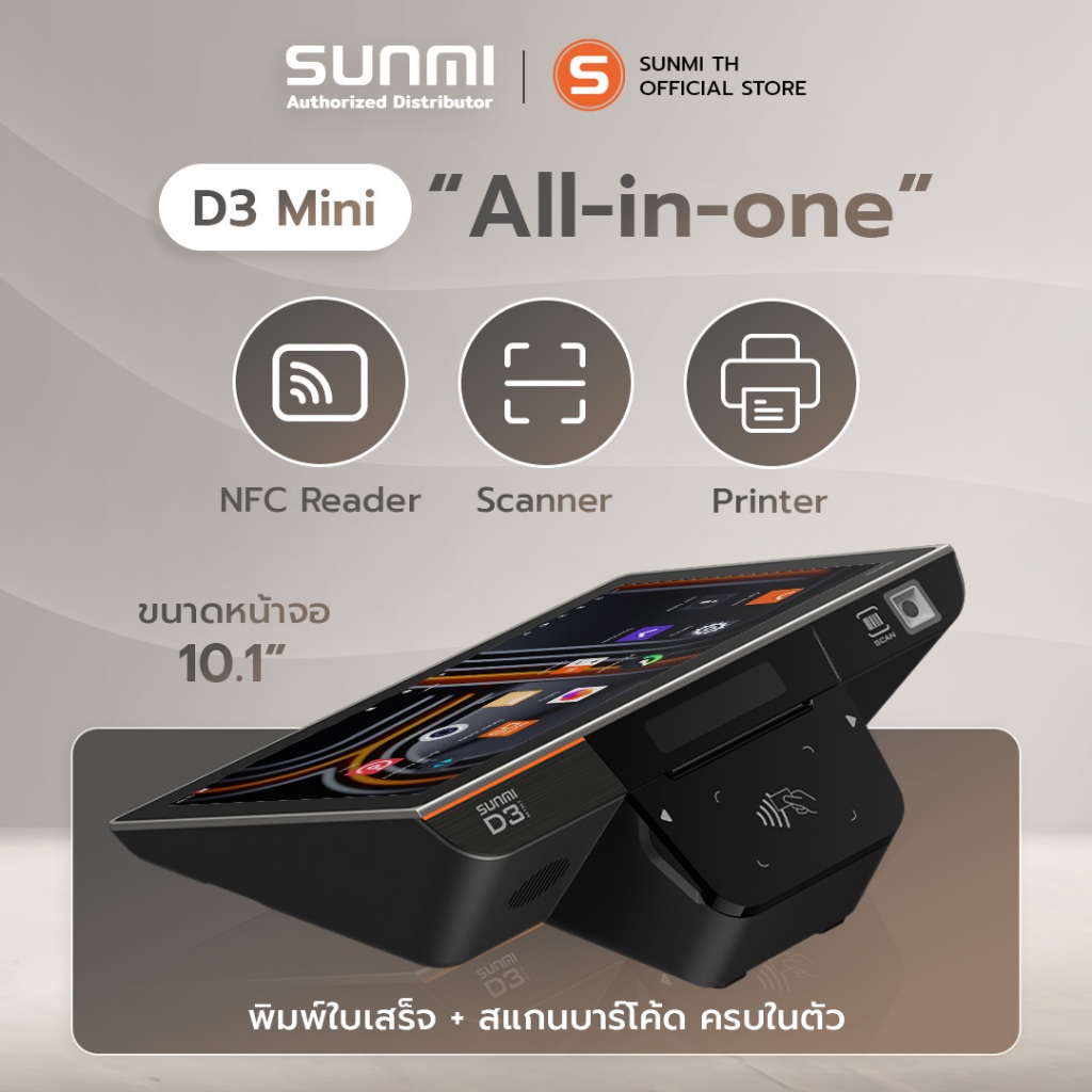 SUNMI D3mini เครื่องคิดเงิน พิมพ์ใบเสร็จและสแกนเนอร์ในตัว พร้อมติดตั้งระบบขายหน้าร้านใช้งานฟรี