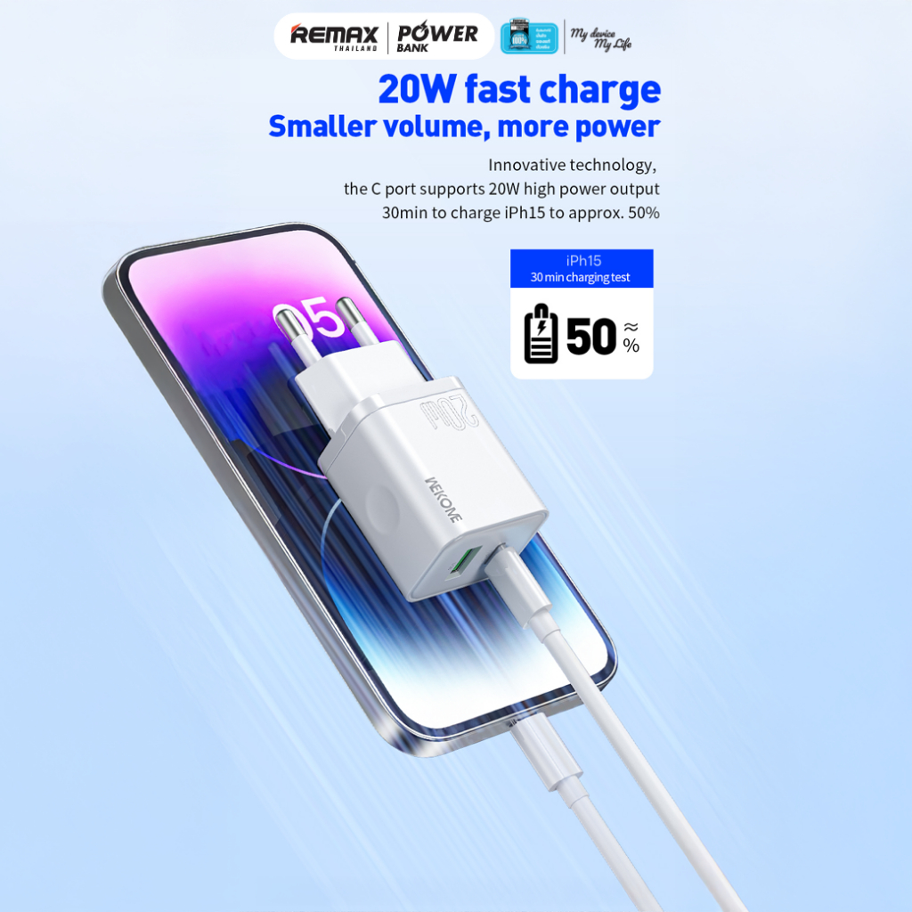 Wekome Adapter Charger รุ่น WP-U60 (Gan 20w) อะแดปเตอร์ 2 พอร์ต USB / Type-C ชาร์จเร็ว 20W มีประกันศูนย์ไทย