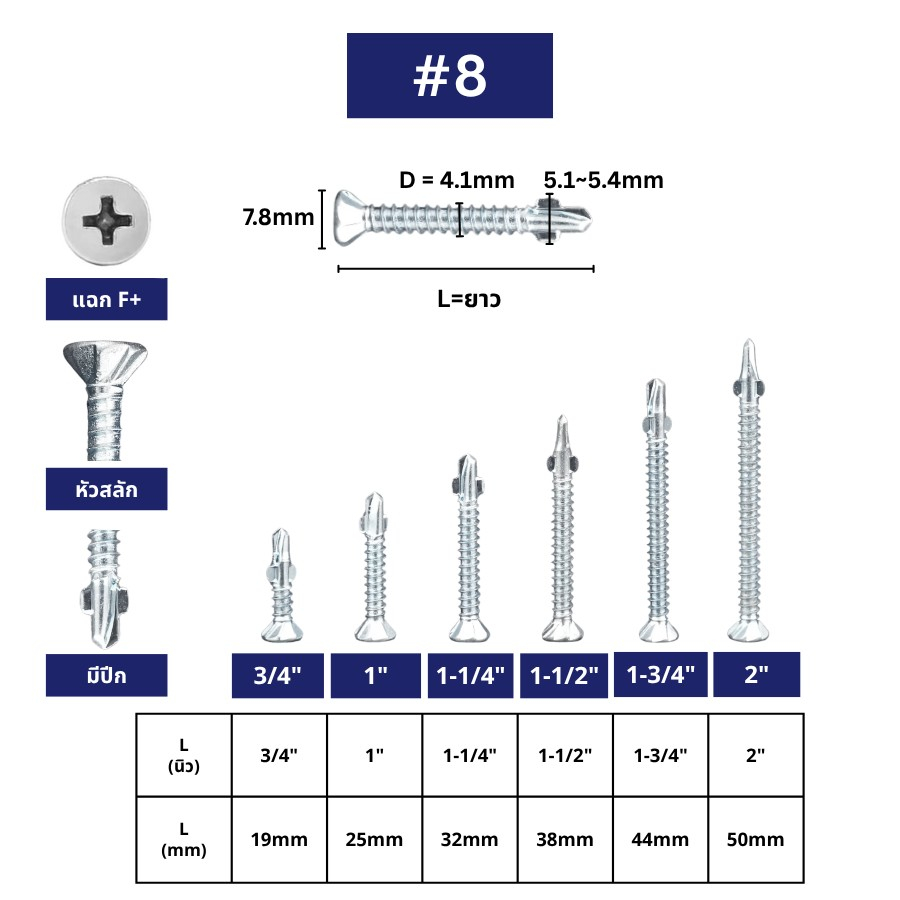 IEPERNG น็อตปีกปลายสว่าน #8 หัวสลัก 1000 ตัว แฉก F+(SA-W) ยึดไม้ฝาเชอร์ร่า เชิงชาย วีว่าบอร์ด
