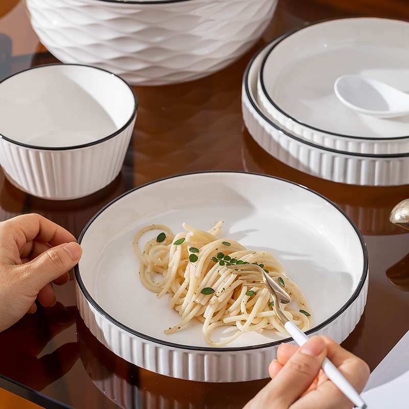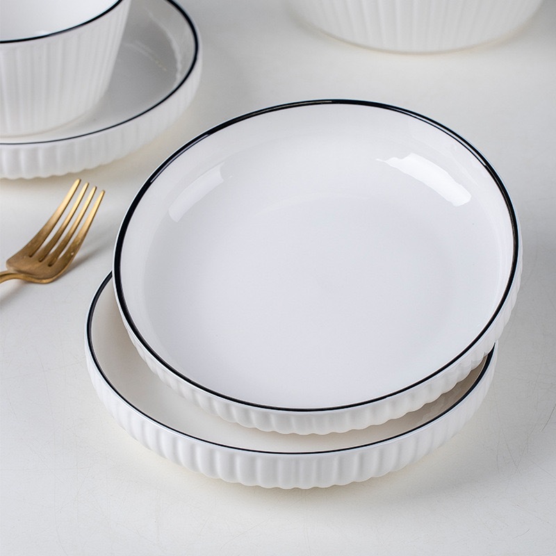 จานขอบสูงลายริ้ว จานเซรามิคสีขาว มินิมอลน่ารัก ขนาด 7,8 นิ้ว