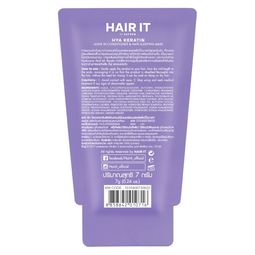 รวม Hair it คอนดิชั่นเนอร์แอนด์แฮร์สลีปปิ้งมาสก์ 7g. / เคราตินอินเทนซีฟแฮร์ทรีทเม้นท์ 12g.