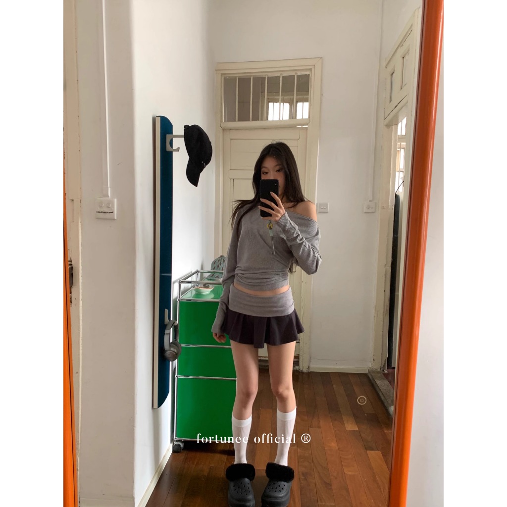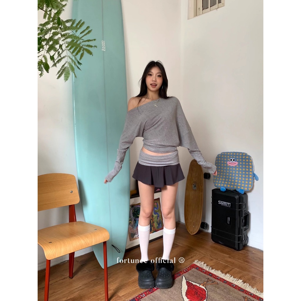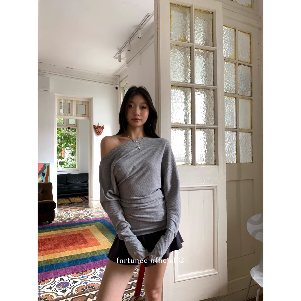 ❣Fortunee ❣ เสื้อยืดแขนค้างคาวไหล่เฉียงเข้ารูปโชว์ไหล่แขนยาว แขนยาว สีเทา