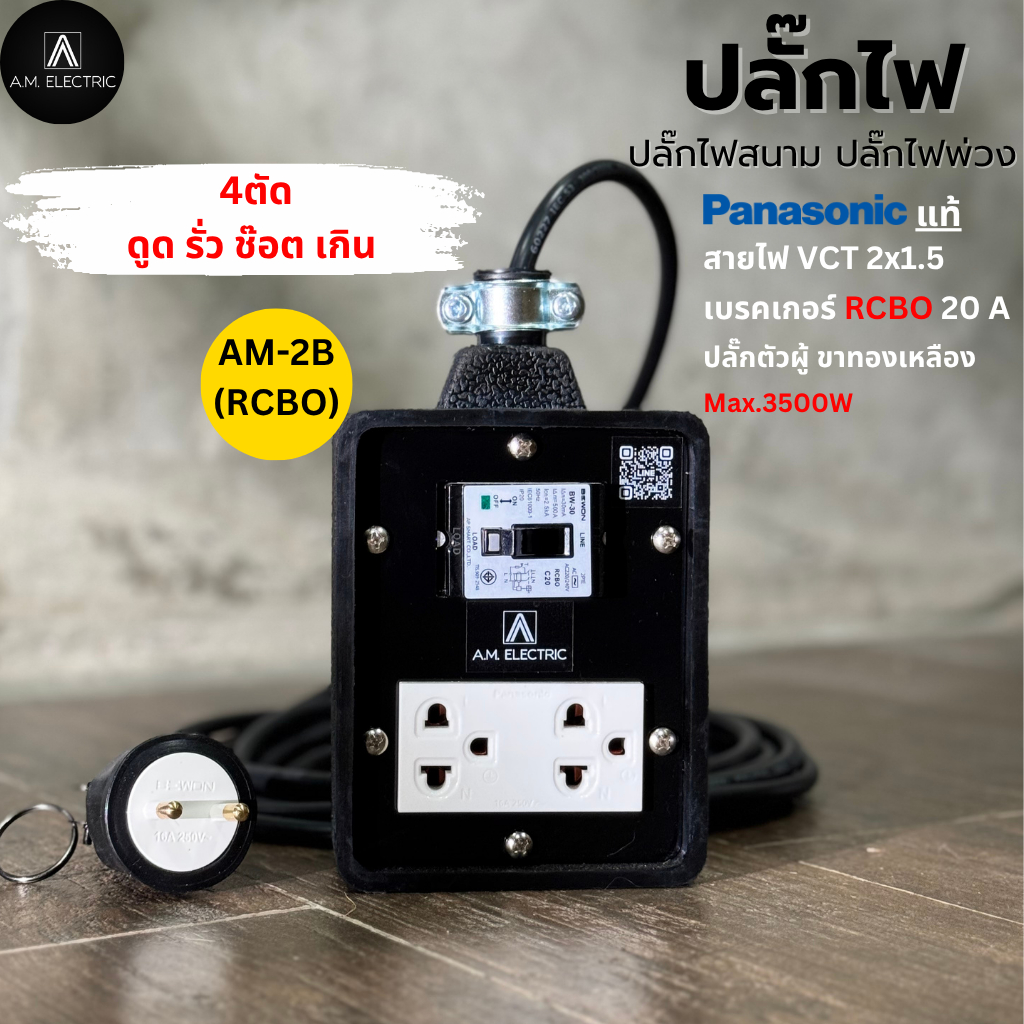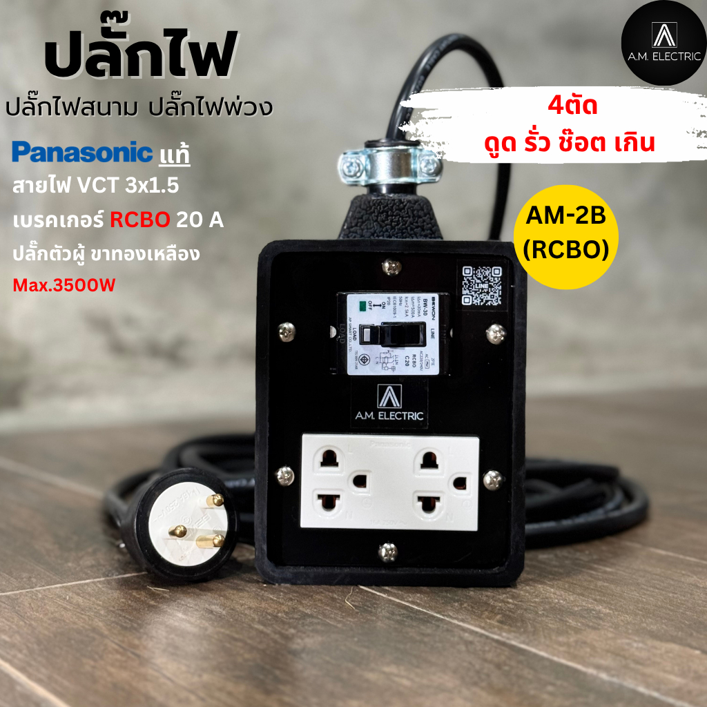 บล็อกยาง 2 ช่องพร้อมปลั๊กกราวด์คู่ Panasonic แท้ รุ่น AM-2B-RCBO เบรคเกอร์ 20A กันดูด กำลังไฟ 3500-4500 W และสายไฟ VCT