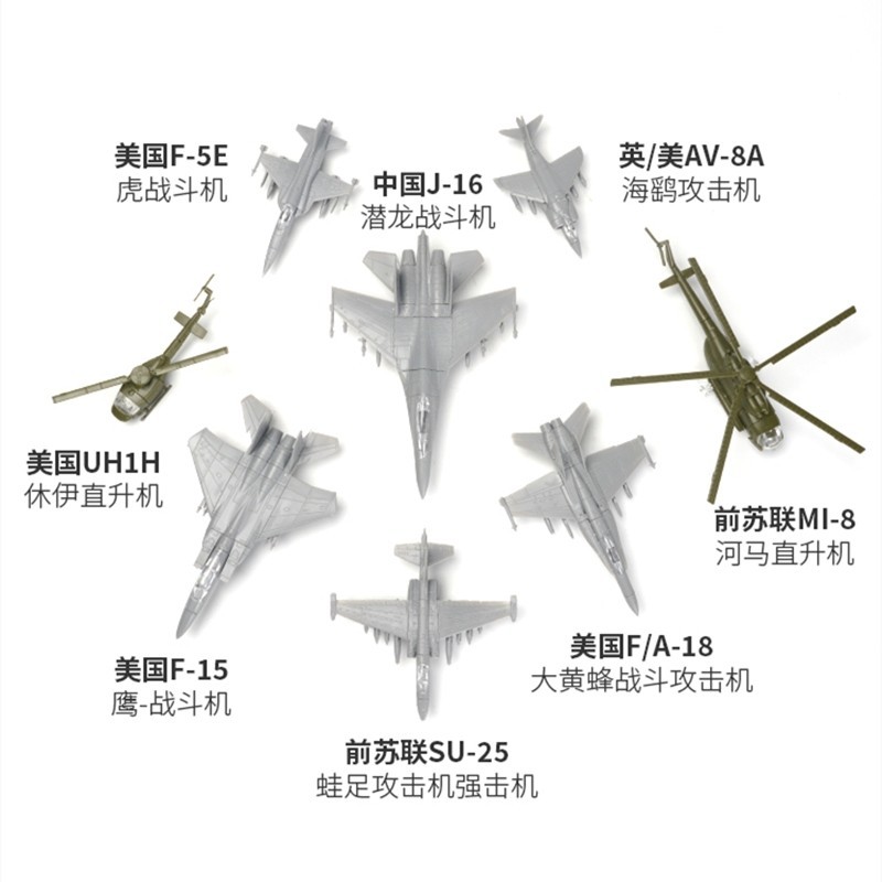 1/144 Scale 8 รูปแบบเครื่องบินประกอบรุ่น AV-8A F-5E F15 F/A-18 UH1H MI8 SU25 J16 Fighter ทหารเครื่องประดับมินิของเล่นพลาสติก, พร้อมฐาน,สีได้