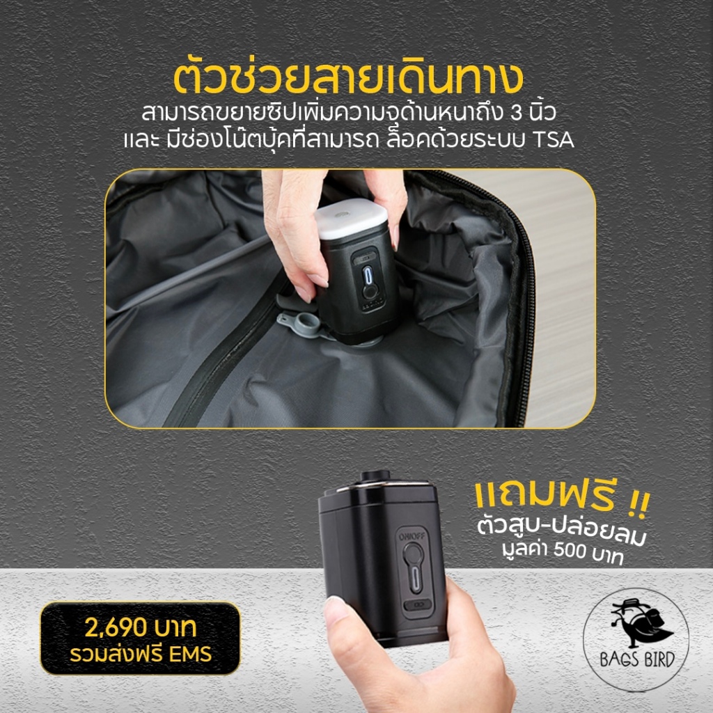 BAGSBIRD NEW รุ่นAB01กระเป๋าสูญญากาศจุ40Lเพิ่มความจุเปิดกว้าง180องศาใส่โน้ตบุ้ค17ผ้ากันน้ำอย่างดี
