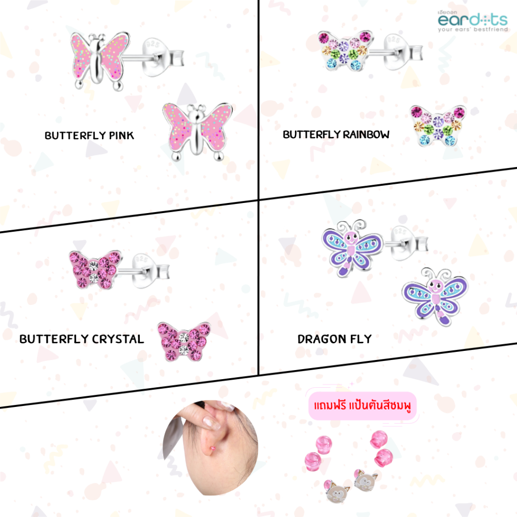 (เงินแท้ 92.5%) ต่างหูสำหรับเด็ก ผิวแพ่ง่าย พร้อมแป้นตันสีชมพู ไม่ทิ่มหลังหู_ES0049