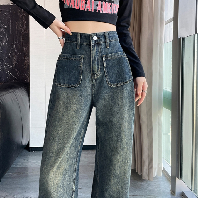 เวอร์ชั่นเกาหลีสไตล์ใหม่ล้างด้อยกางเกงยีนส์ตรงผู้หญิงออกแบบหลายกระเป๋าหลวมกว้าง-ขา โฟล