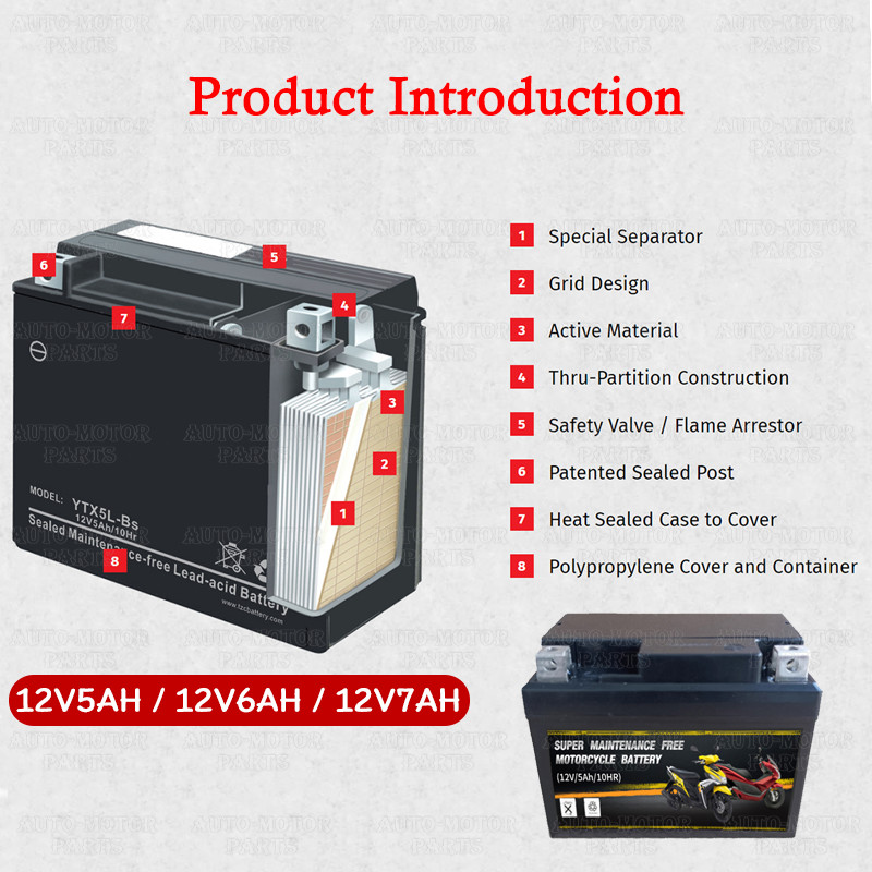 แบตเตอรี่รถจักรยานยนต์ 12V 5AH 6AH 7AH สำหรับ WAVE, DREAM, Mio New, MSX, SCOOPY-I, FINO, CLICK110, SUPERCUP, KSR