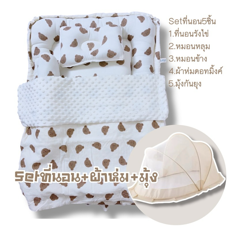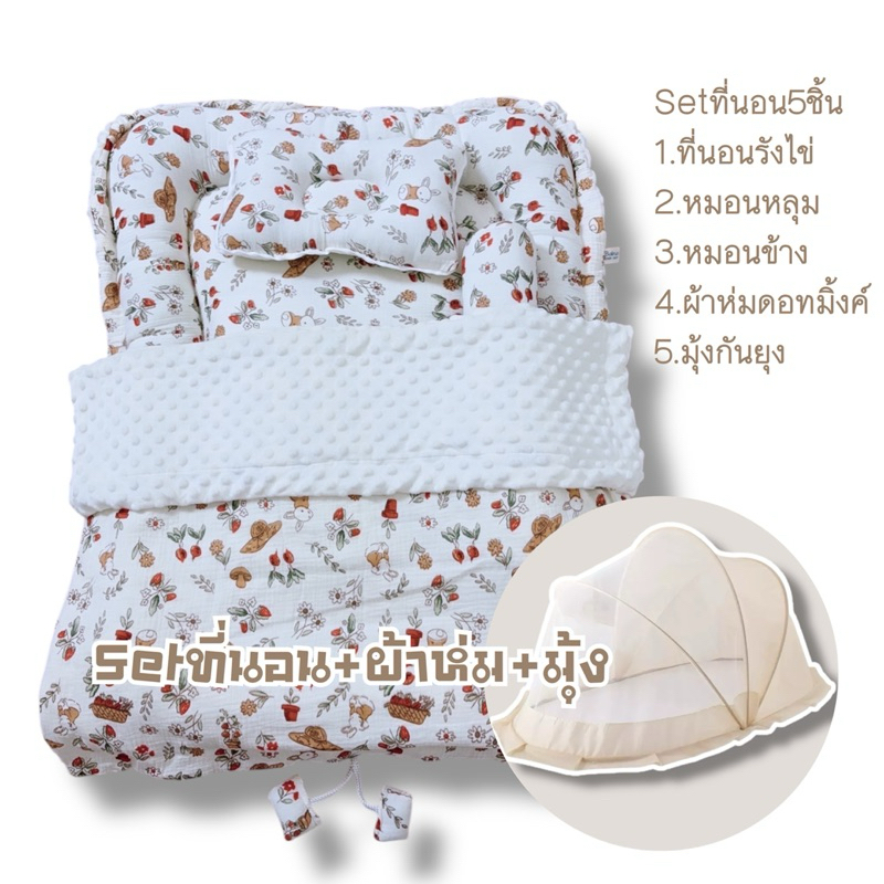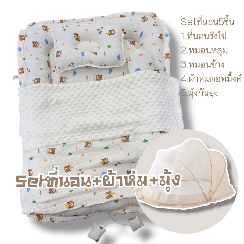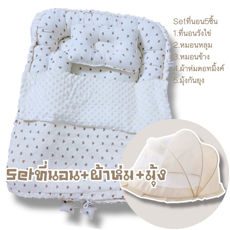 Setที่นอน5ชิ้น setที่นอนรังไข่+ผ้าห่ม+มุ้งกันยุง เด็กแรกเกิด มัสลินย่นดอทมิ้งค์