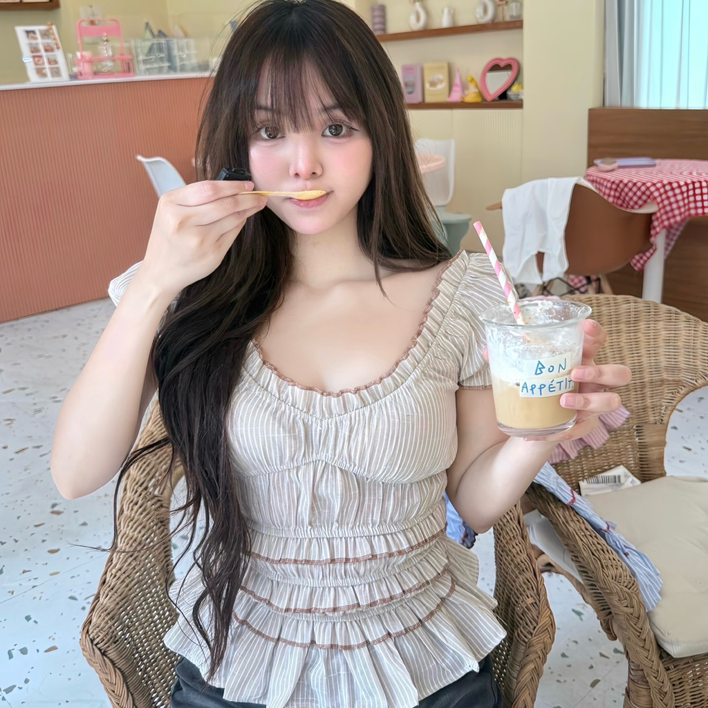 Petite♡︎ Melt top เสื้อสม็อคทั้งตัวผ้าลายริ้วกุ๊นด้ายแดง สไตล์เกาหลีเกาใจ ลายจุด Polkadot ใส่ได้ทั้งปาดไหล่และขึ้นไหล่
