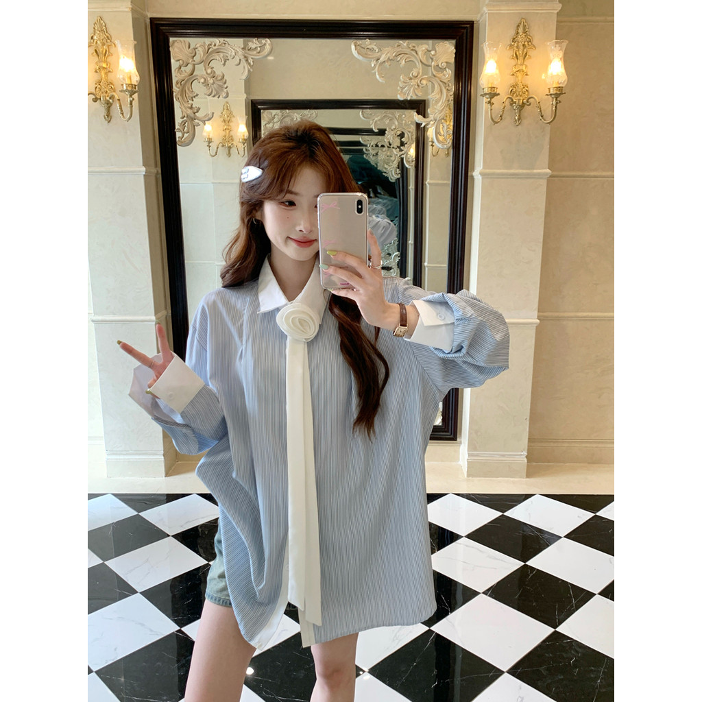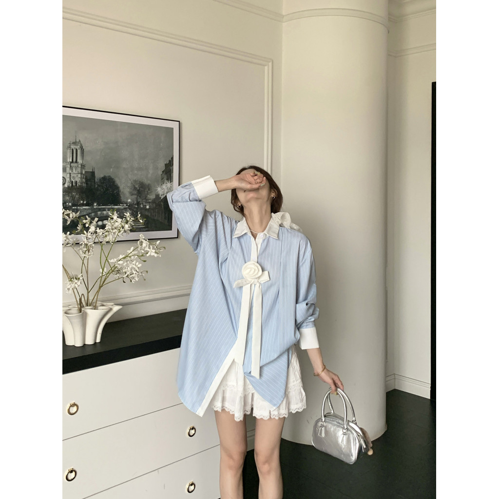 ฤดูใบไม้ผลิใหม่สบายๆที่เรียบง่ายอ่อนโยนเสื้อเชิ้ตลายทางสีฟ้าผู้หญิง 250326