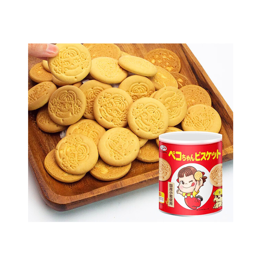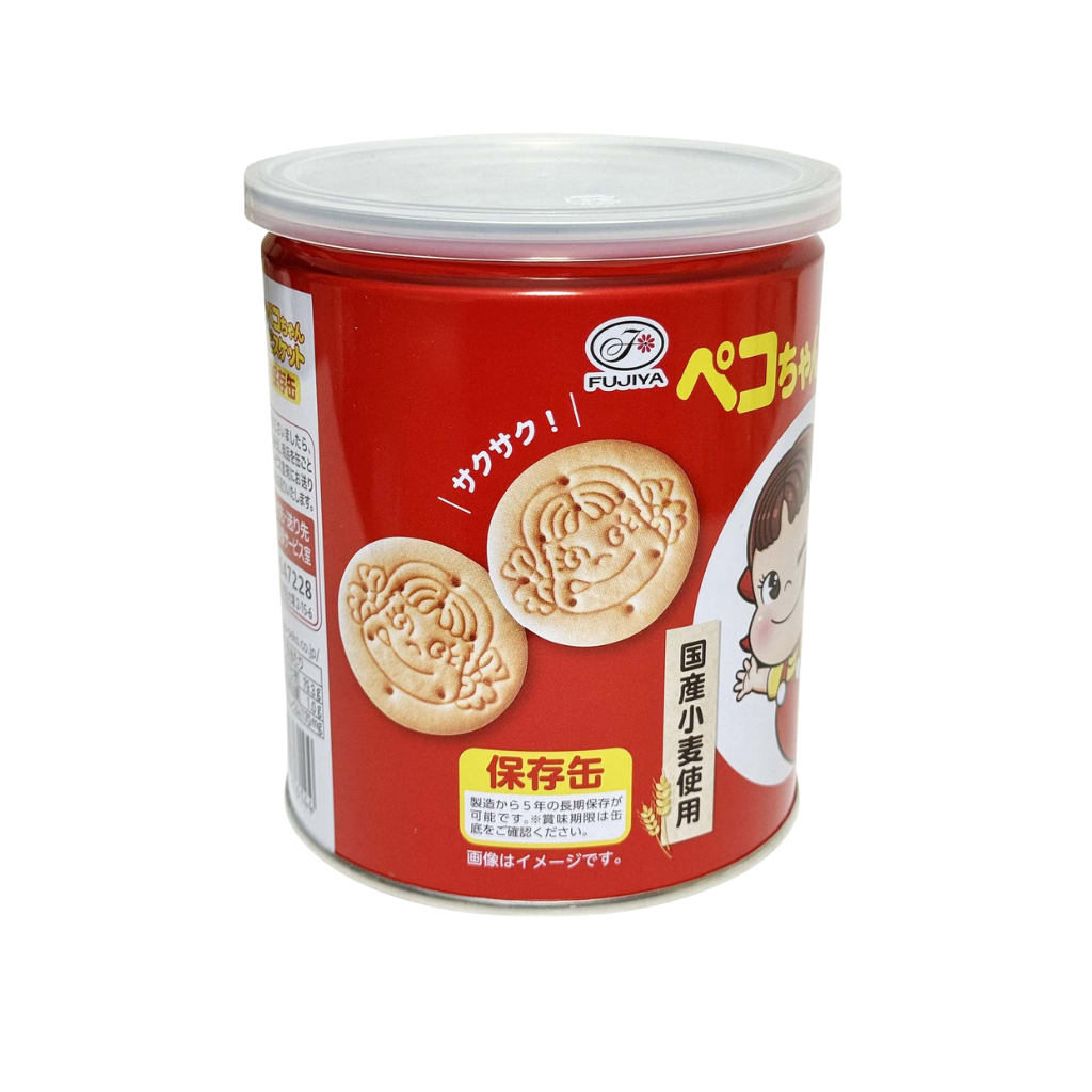 Fujiya Peko-Chan Biscuit StorageTinเปะโกะจังบิสกิตรสชาติกรอบหอมหวานนิดๆอร่อยเสริมแคลเซี่ยม บรรจุ100g