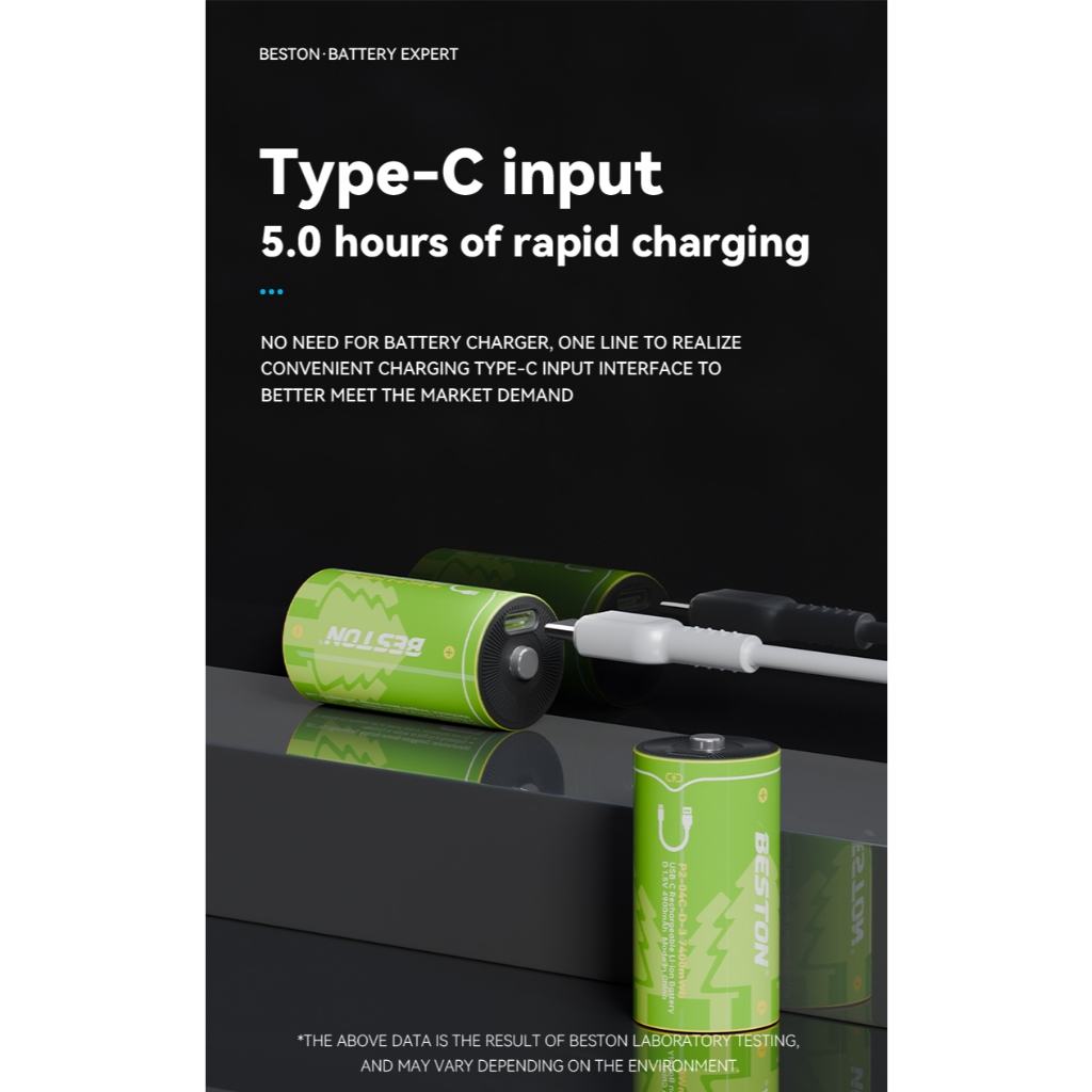 ถ่านชาร์จ Beston Size-D 1.5V 7400mWh ชาร์จด้วย Type-C USB แบตเตอรี่แบบชาร์จไฟได้ (1 แพ็ค 2 ก้อน)