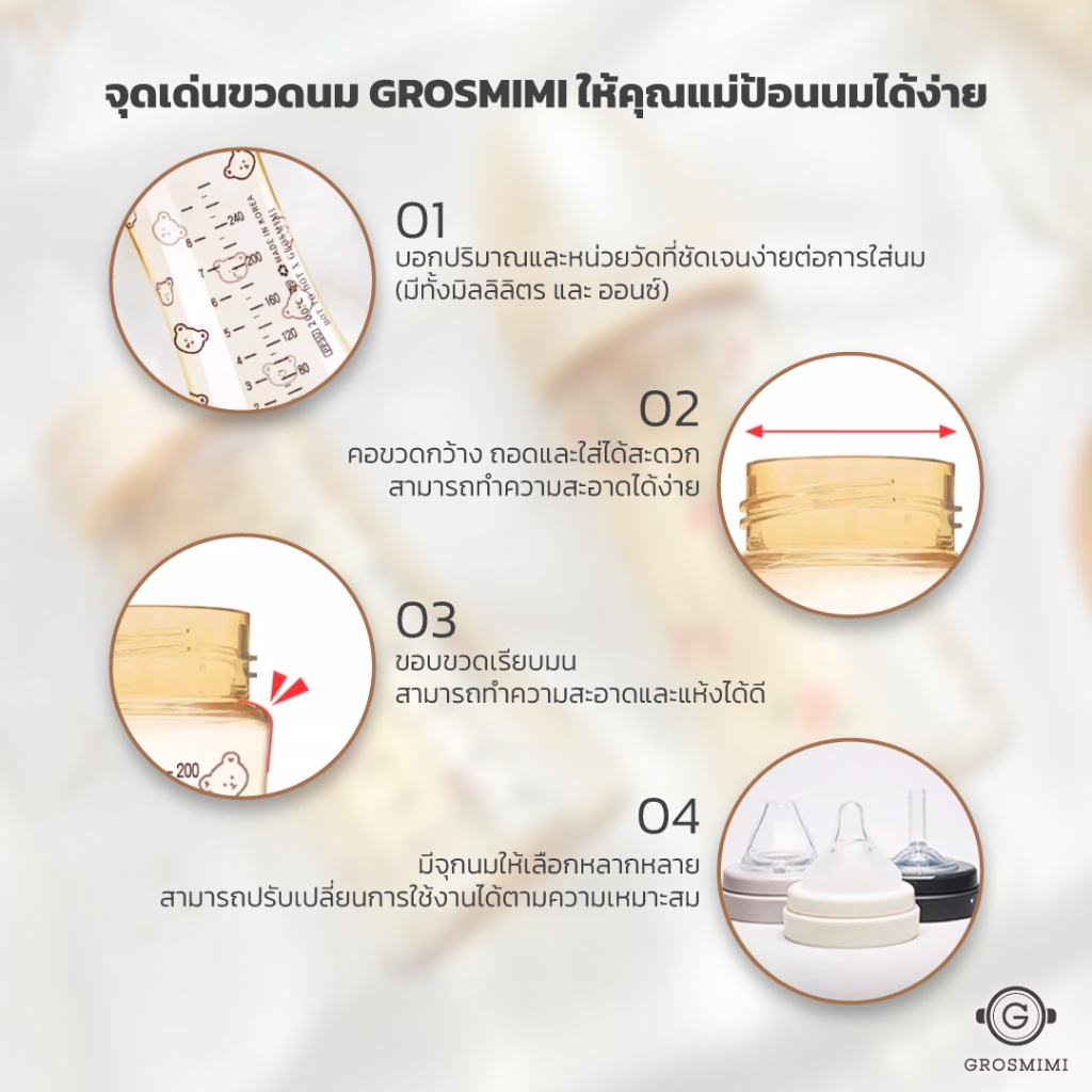 เซ็ตขวดนม Grosmimi PPSU คอกว้าง 200มล. รวมลาย 5 ขวด บรรจุพร้อมจุกนม Stage1 (สำหรับเด็กอายุแรกเกิดหรือ 1เดือนขึ้นไป)
