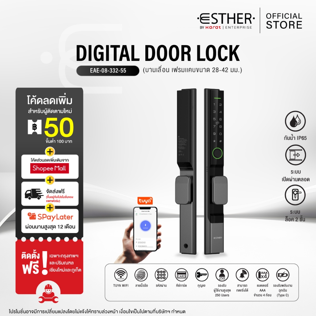 Esther ชุดล็อคประตูบานเลื่อนระบบดิจิตอลพร้อมระบบ TUYA EAE-08-332-55