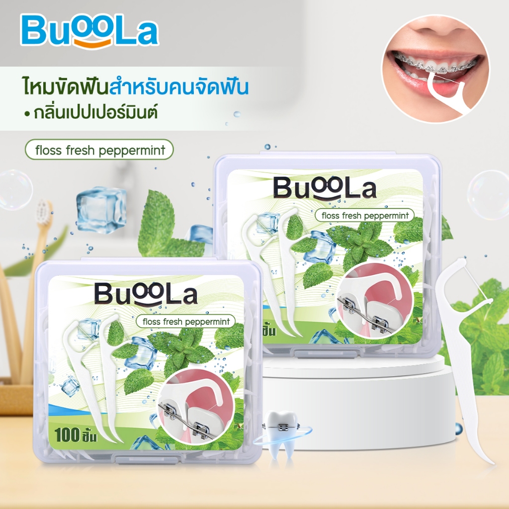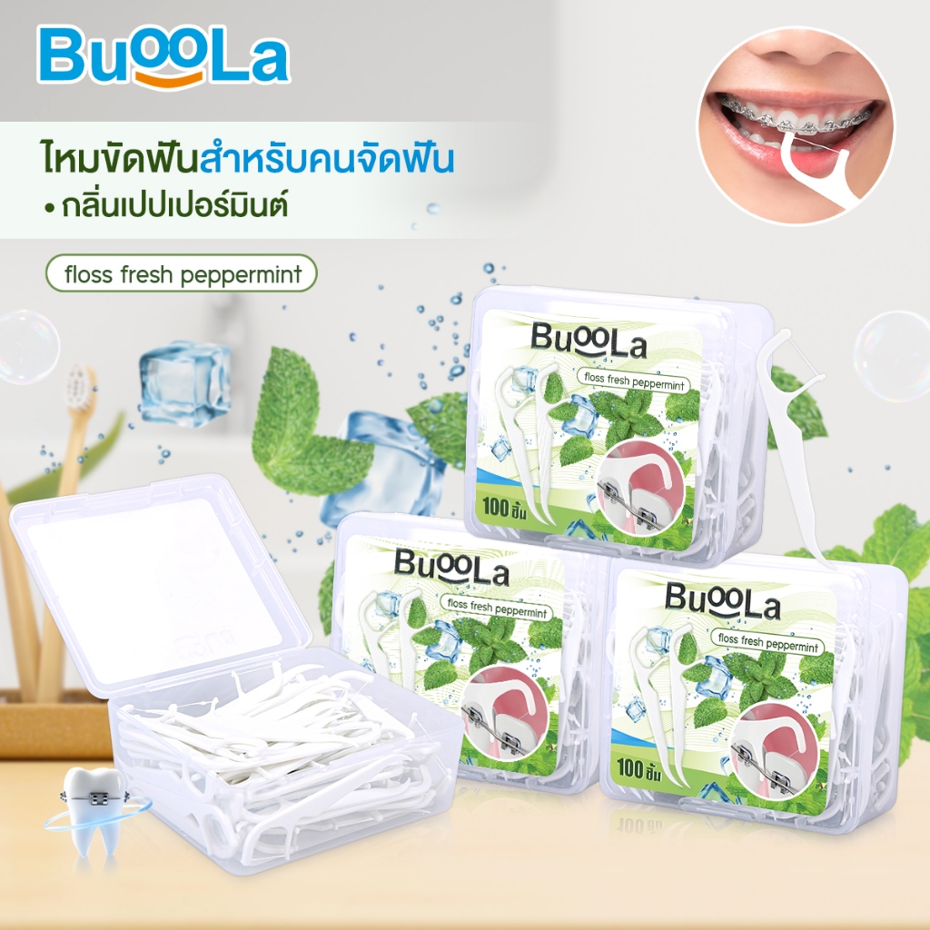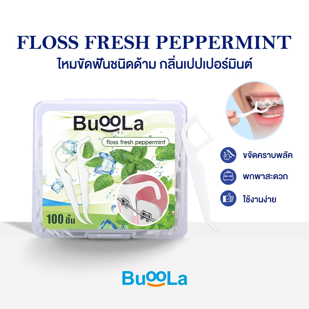 [มีให้เลือก 1-4 กล่อง] Buoola ไหมขัดฟัน กลิ่นเปปเปอร์มินท์ ช่วยขจัดเศษอาหาร เส้นไหมเหนียวทน