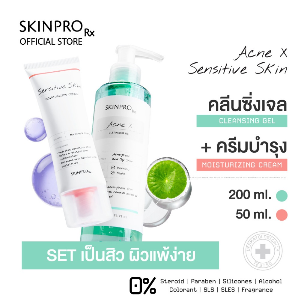 SKINPRO Rx SET เป็นสิวผิวแพ้ง่าย - Acne X Cleansing Gel 200ml & Sensitive Skin Moisturizing Cream 50ml