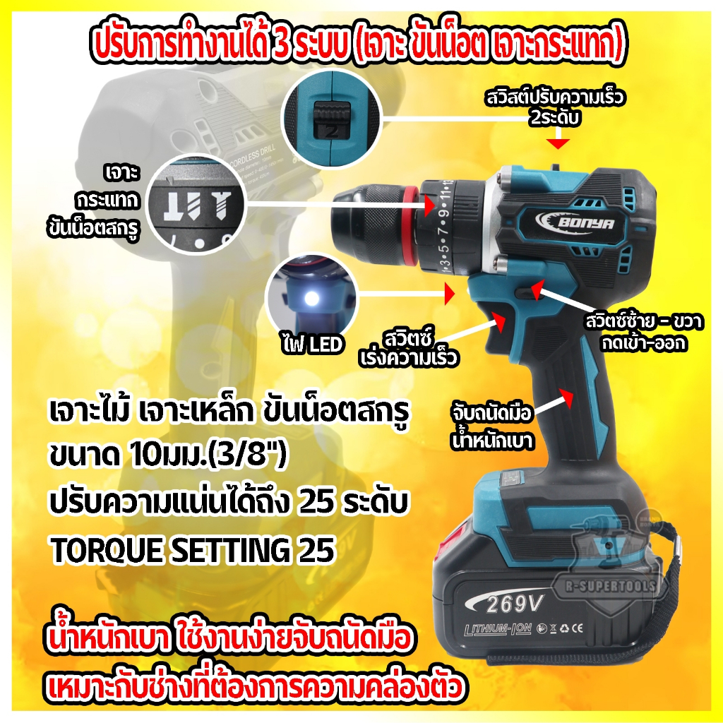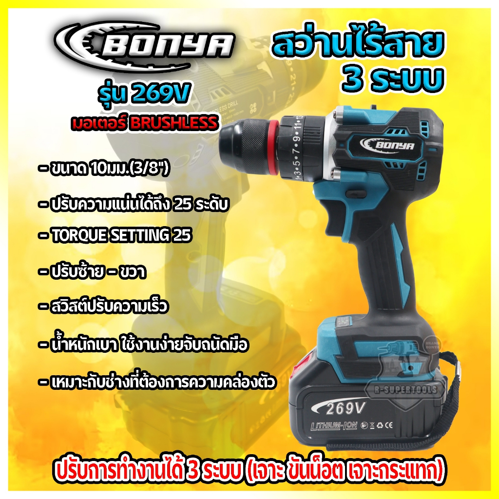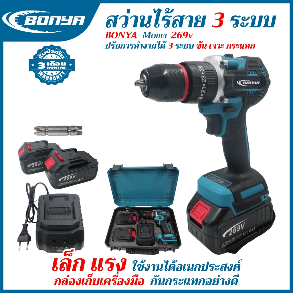BONYA สว่านบรัชเลส สว่านไร้สาย 269V 3ระบบ แบตเตอรี่ 2 ก้อน