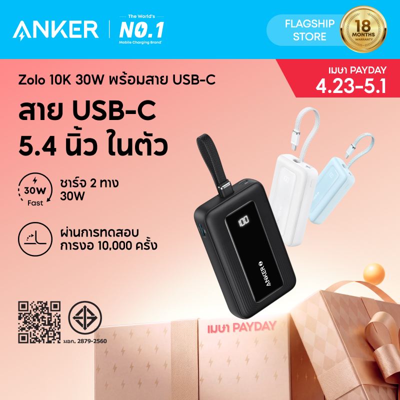 ANKER Zolo Power Bank 20,000mAh/10,000mAh|ชาร์จเร็ว PD30W| พาวเวอร์แบงค์'แบดตสํารองมีขาปลั๊กสายในตัว| for iPhone 17/16/15/iPad MacBook