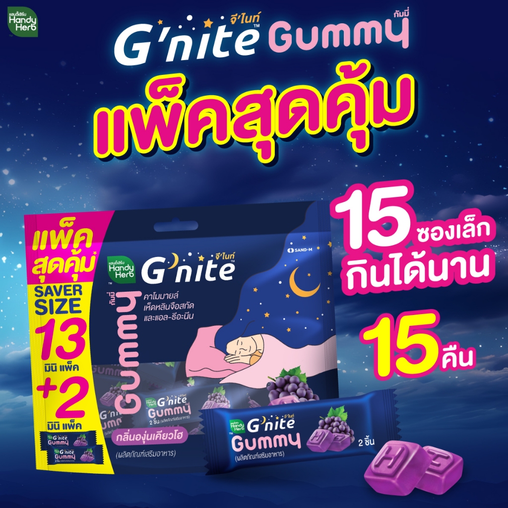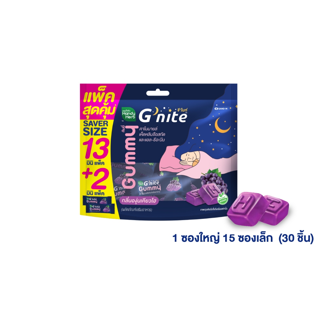 HandyHerb G'nite Gummy Saver Size จี’ไนท์ กัมมี่ แพ็กใหญ่สุดคุ้ม กลิ่นองุ่นเคียวโฮ 1 แพ็ก (15 ซอง, 30 ชิ้น)