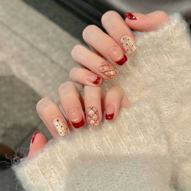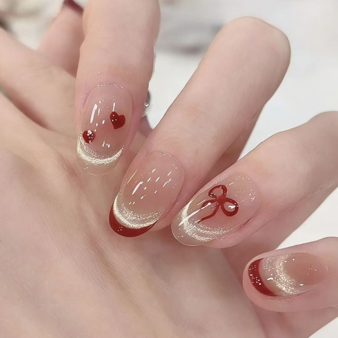 [กาวฟรี] เล็บปลอมติดกาวฟรี เล็บสั้นทรงอัลมอนด์ เครื่องประดับสงกรานต์ กันน้ำ