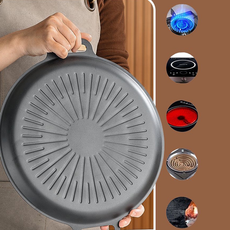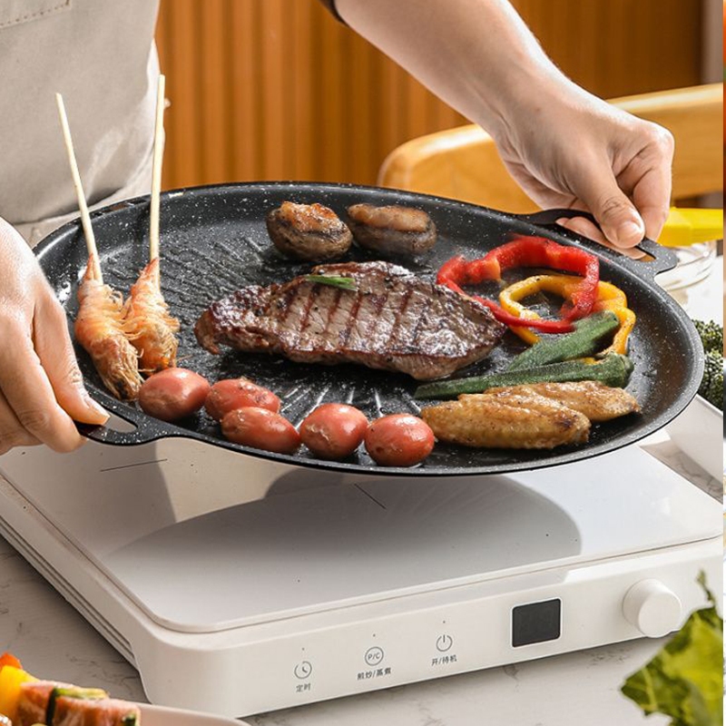กระทะปิ้งย่างทรงแบนสำหรับเตาแก๊ส เตาถ่านและเตาอื่นๆ พกพาสะดวก สินค้ามี3ขนาด 29/33เซนติเมตร หูคู่ ถาดบาร์บีคิว B0146