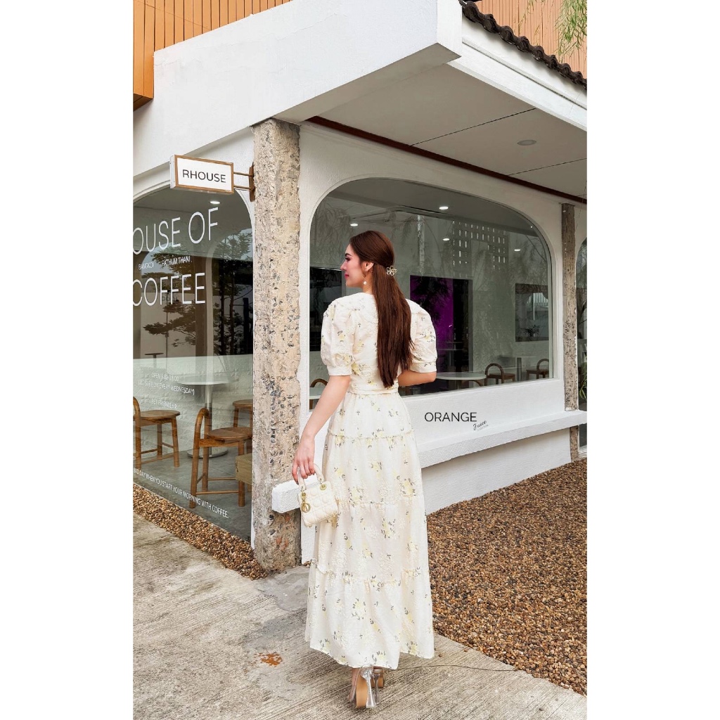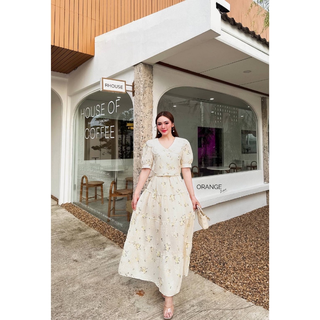 OR31250 ชุดเซ็ทผ้าคอตต้อลฉลุพิมพ์ลาย สีครีมละมุน เสื้อแต่งปกด้วยลูกไม้ กระโปรงทรงเอ
