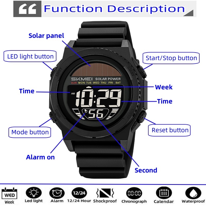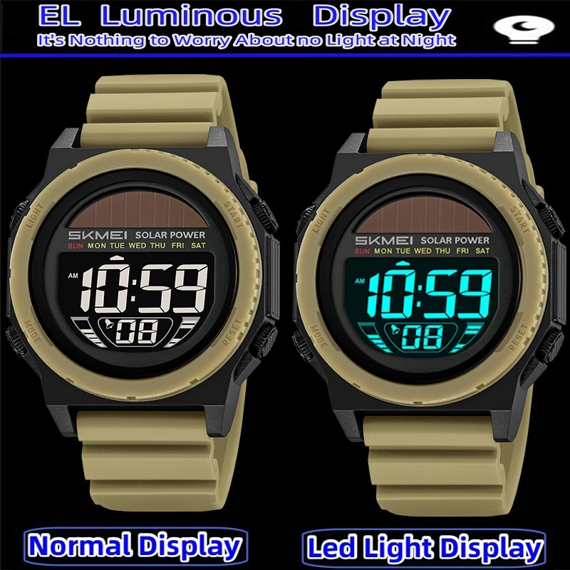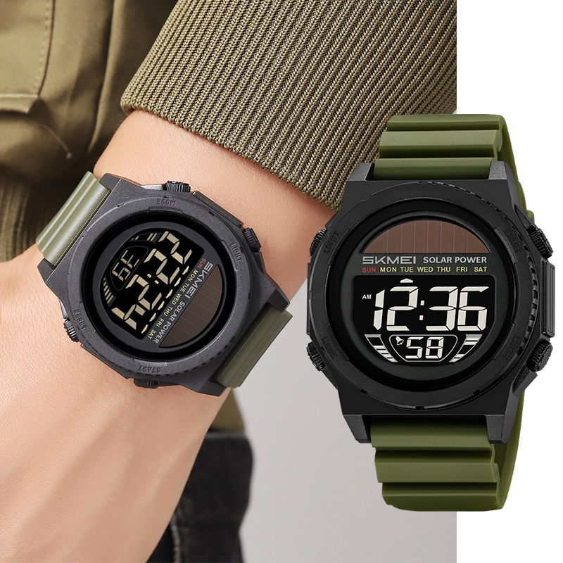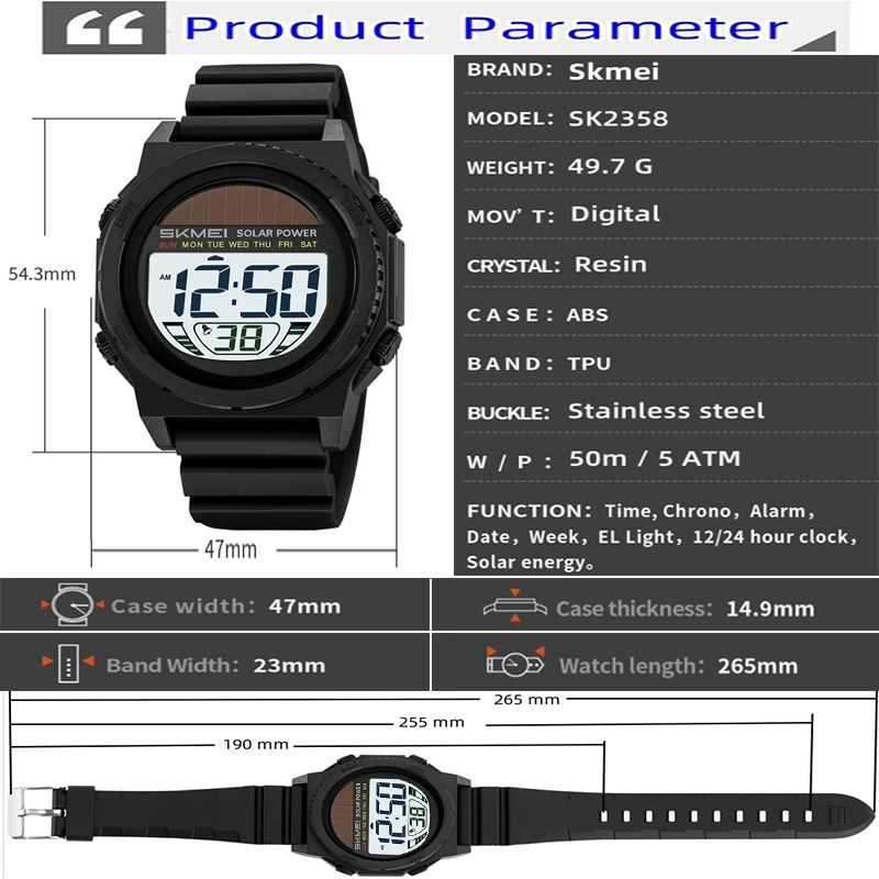 Skmei พลังงานแสงอาทิตย์บุรุษกีฬานาฬิกาวันที่สัปดาห์จอแสดงผลแฟชั่นสายรัด TPU LED กันน้ําดิจิตอลโครโนกราฟ