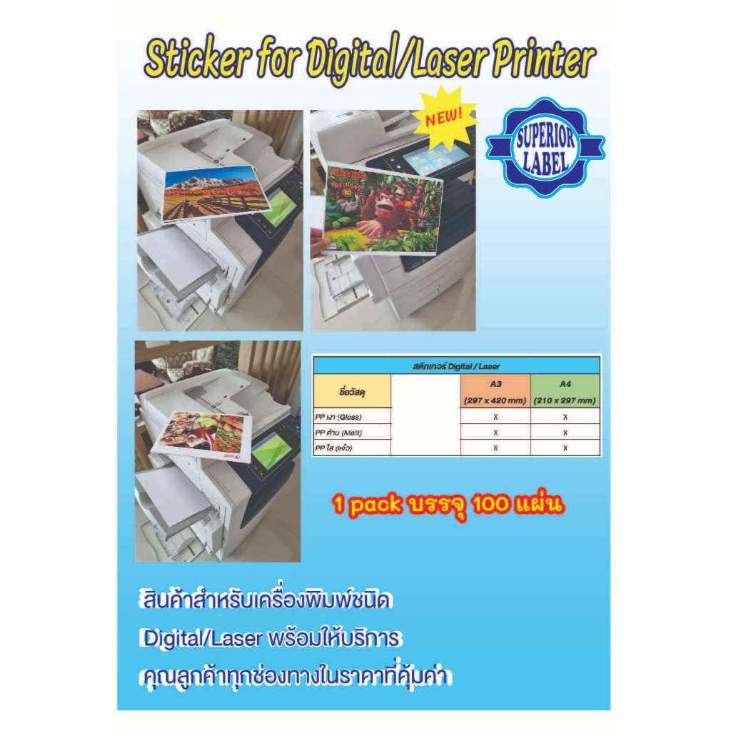 สติ๊กเกอร์ Digital / Laser PP Matt (PP ด้าน) A4, A3 บรรจุ 100 แผ่น