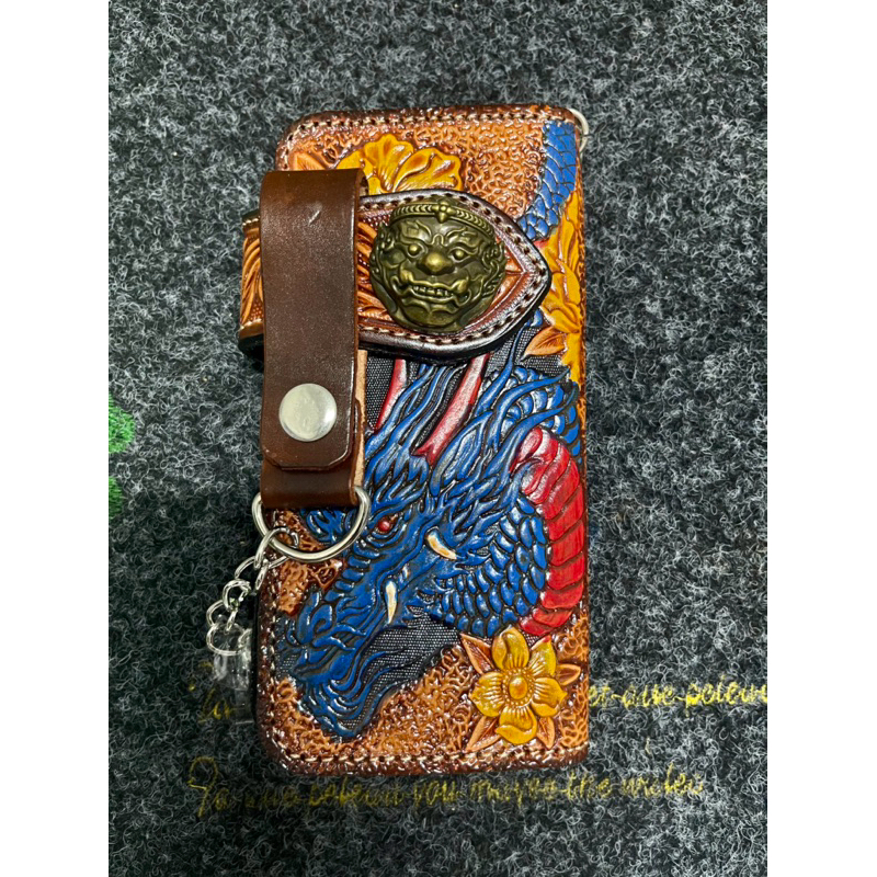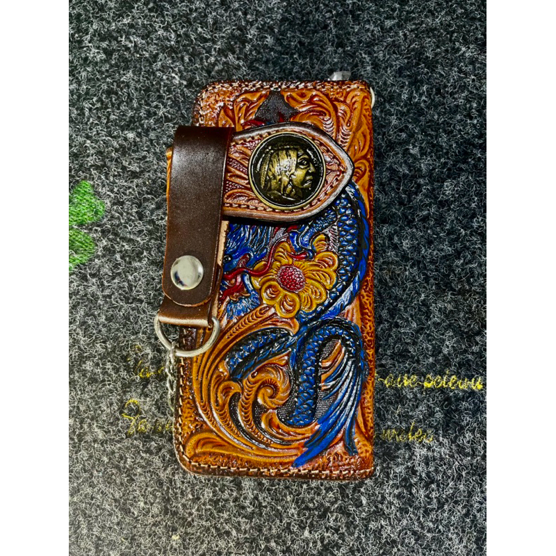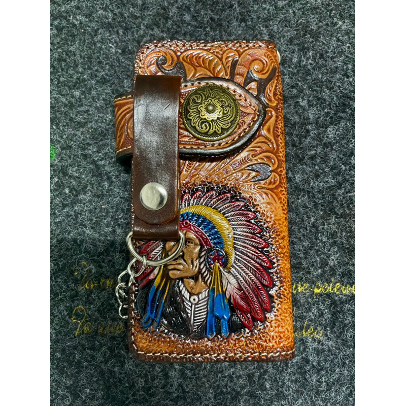 กระเป๋าหนังวินเทจใบยาว กระเป๋าหนังวัวตอกลาย หนังแท้ 100% กระเป๋าสตางค์ผู้ชายแถมฟรีสายโซ่ครองเข็มขัดหนึ่งเส้น