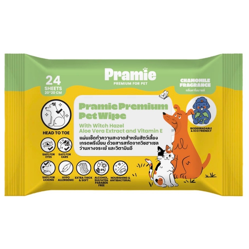 [12แถม1] Pramie แผ่นเช็ดทำความสะอาดสำหรับสัตว์เลี้ยง สูตรกลิ่นคาโมมายล์ แพ็คเล็ก 24 แผ่น 20x20 ซม.