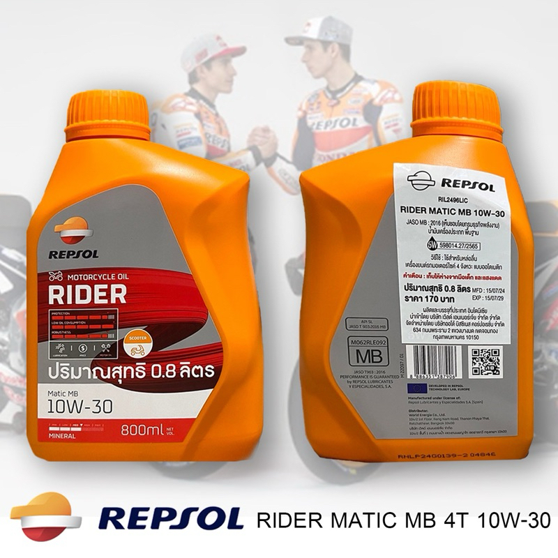 น้ำมันเครื่อง REPSOL RIDER Matic MB 10W-30 ( ไรเดอร์ เมติก MB 4T 10W-30 ) 0.8ลิตร Repsolเภียร์Ma10w40