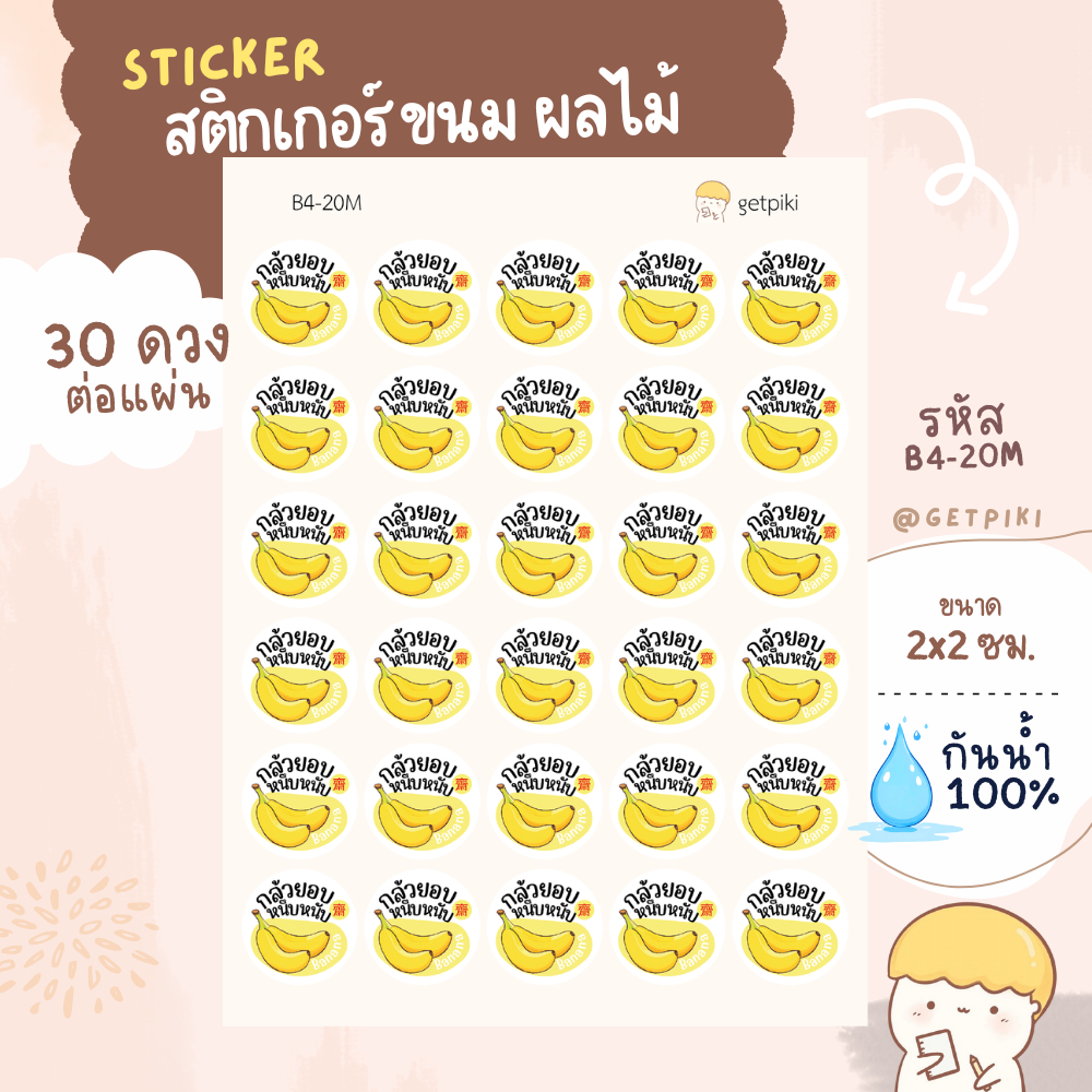 sticker กล้วย ขนม ผลไม้ ที่ทำจากกล้วย วงกลมมี 4 ขนาด กันน้ำ 100% กล้วยน้ำว้า กล้วยหอม กล้วยเบรคแตก กล้วยอบเนย กล้วยหนึบ