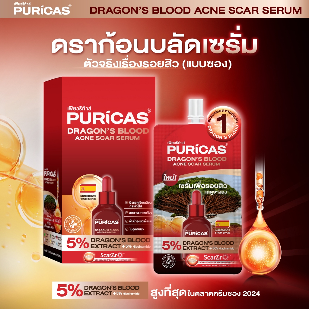 (แพ็ค 4 ซอง) Puricas Dragon's Blood Acne Scar Serum 7ml. เซรั่มเพื่อรอยสิว