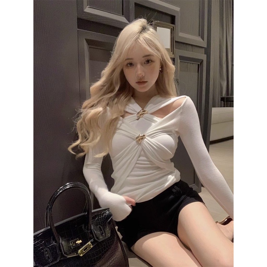 ขายร้อน! เสื้อมีสไตล์ F & X เสื้อยืดผูกเชือกสีขาวเสื้อตัวในแขนยาวสำหรับฤดูใบไม้ร่วงของผู้หญิงเสื้อตัวในแขนยาวสำหรับฤดูใบไม้ร่วง