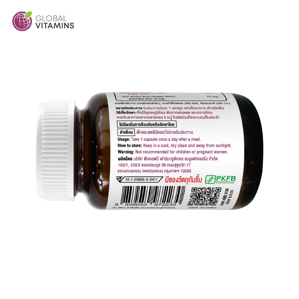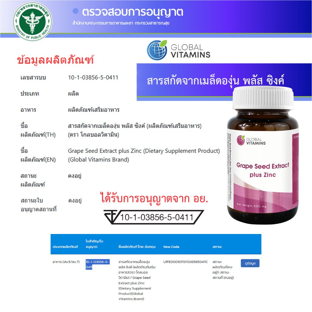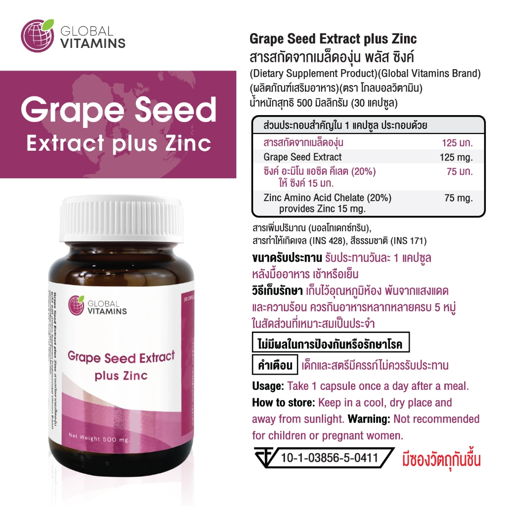 [แพ็ค 3 ขวด] เกรปซีด โกลบอลวิตามิน เกรปซีดพลัส Grape Seed Extract plus Zinc Global Vitamins เกรปซีดพลัสซิงค์ เมล็ดองุ่น
