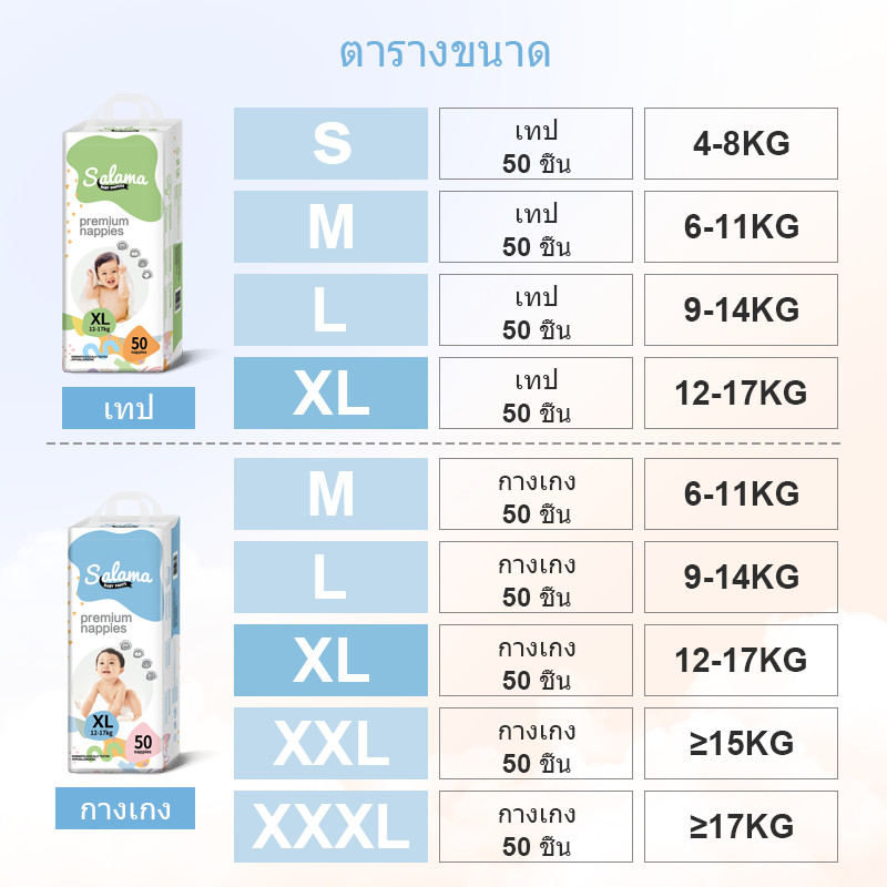 SALAMA 50ชิ้น ผ้าอ้อม กางเกง เทป เด็ก BABY DIAPER PANTS S/M/L/XL/XXL/XXXL นุ่ม บางเบา
