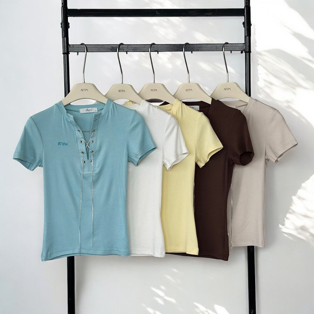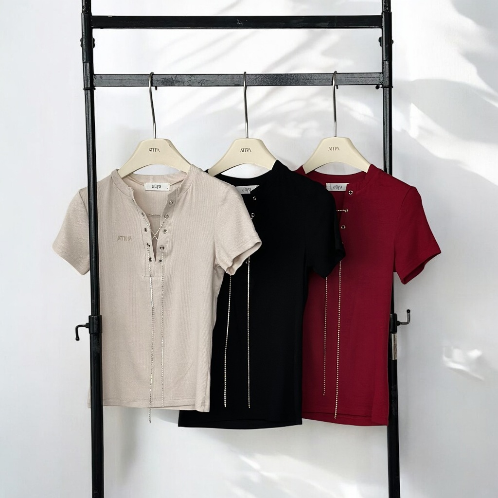 Atipashop - ALGER CHAIN TOP เสื้อยืด แขนสั้น คอกลม ผ้าไหมพรม ดีเทลสายโซ่คล้องคอ