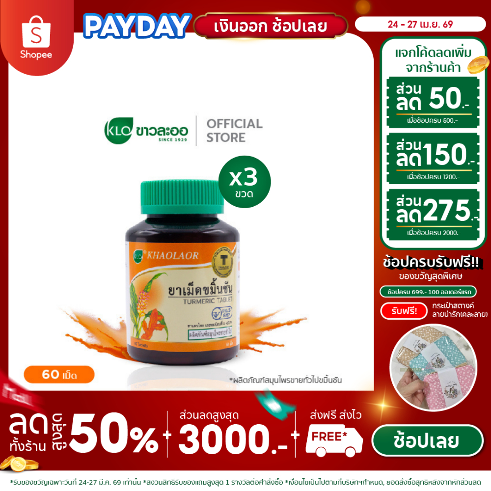 (แพ็ค 3) Khaolaor ขาวละออ ยาเม็ดขมิ้นชัน 60 เม็ด/ขวด