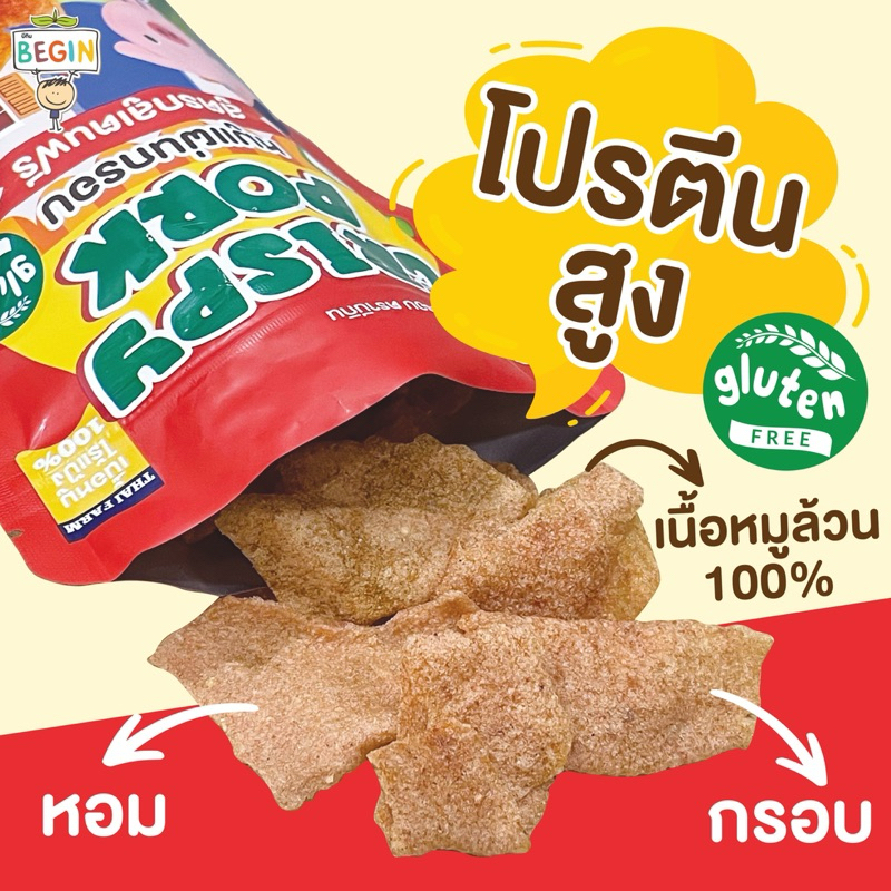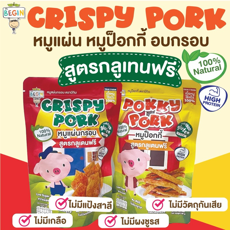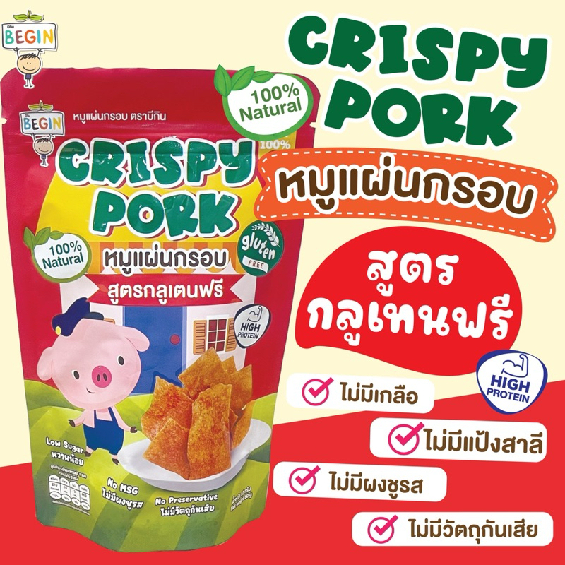 Begin หมูแผ่นสูตรกลูเทนฟรี (ถุงซิปล็อค)ไร้แป้ง กรอบ บาง อร่อย อาหารสำหรับเด็ก ขนมเด็ก หมูแผ่นเด็ก ของทานเล่น หมูกรอบ