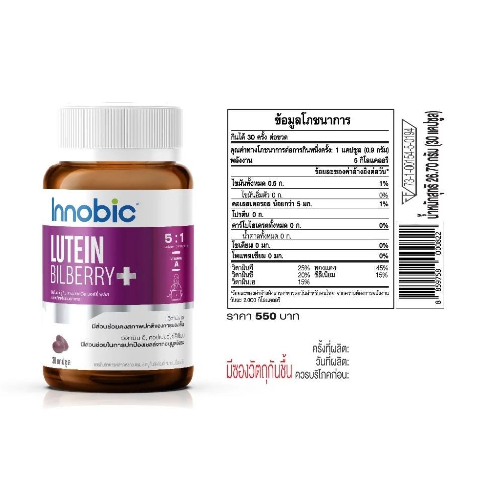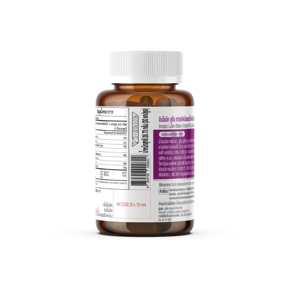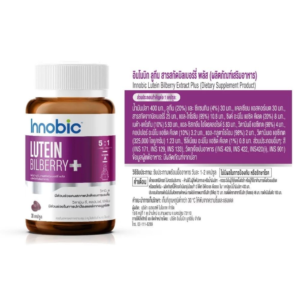 INNOBIC Lutein Bilberry Extract Plus ผลิตภัณฑ์เสริมอาหารอินโนบิก ลูทีน สารสกัดบิลเบอร์รี่ พลัส (30 แคปซูล)