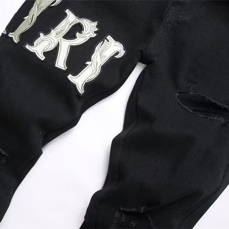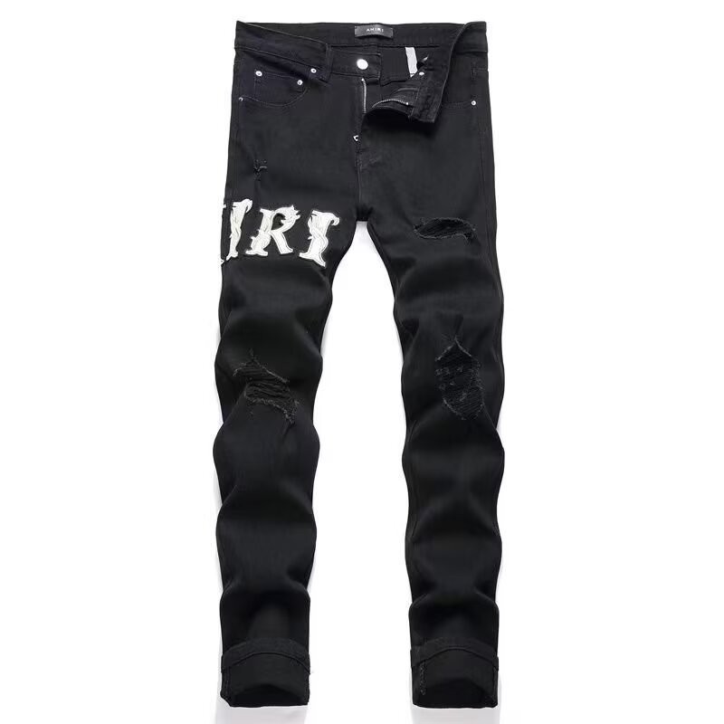 ฮันลู สูง ถนน แฟชั่นแบรนด์ใหม่ปักกางเกงยีนส์ผู้ชายสีดําฉีกแพทช์ยืดสลิมฟิต