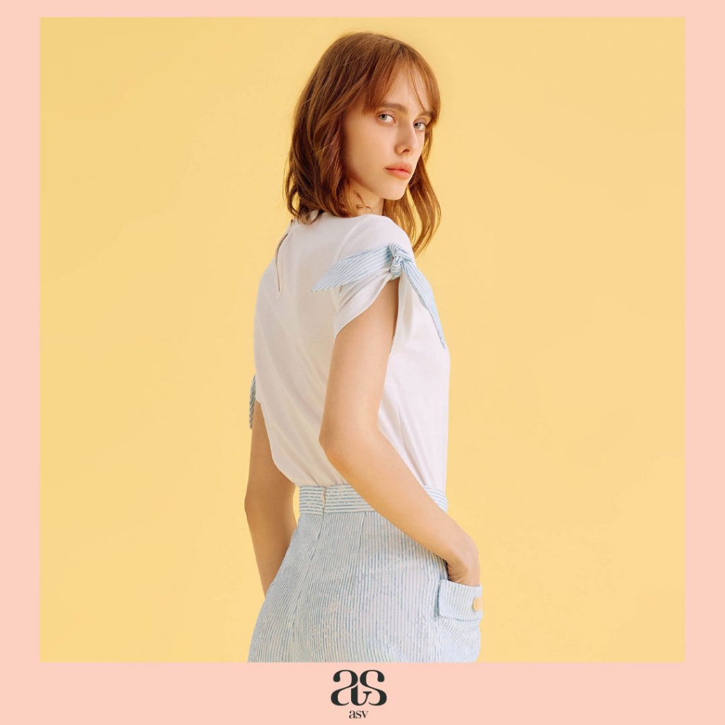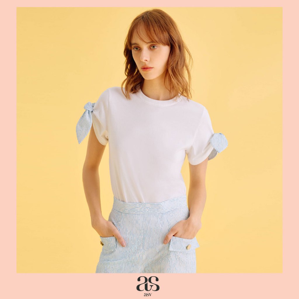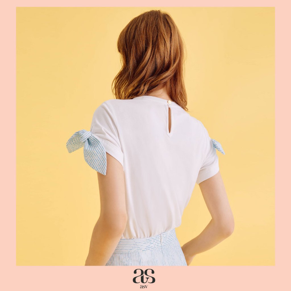 [asv ss25] Lillian T-Shirt เสื้อยืดผู้หญิง แขนสั้น ดีเทลผูกปมที่แขนเสื้อ แต่งกระดุมคล้องห่วงด้านหลัง