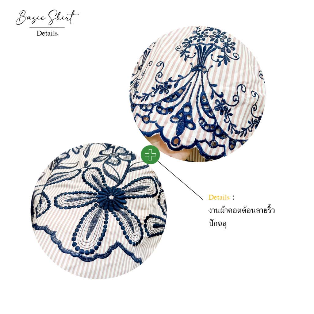 #3660 MondLune เสื้อเบลาส์คอกลม แขนสั้น ลายปักฉลุ ผ้าคอตตอนลายริ้ว ทรงโอเวอร์ไซด์ ใส่สบาย