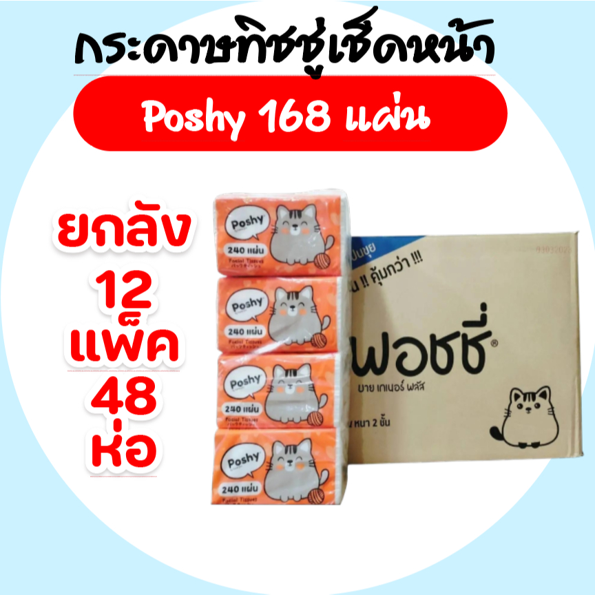 [ลัง 12 แพค] Poshy พอชชี่ กระดาษทิชชู่เช็ดหน้า ห่อ240แผ่น หนา2ชั้น แพค4ห่อ