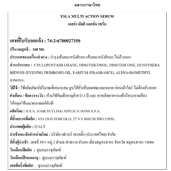 ESLA เอสล่า MULTI ACTION SERUM 100 ML ผลิตภัณฑ์เซรั่มบำรุงเส้นผมเพิ่มความเงางาม เหมาะกับผมชี้ฟูและแห้งเสียเป็นพิเศษ